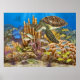 Das ist ein Bild eines karibischen Korallenriffs mit einer juvenilen grünen Schildkröte, umgeben von mehreren Riffarten. Die Illustration stammt von Dawn Witherington.