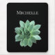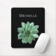 Grünes sukkulentes Mauspad mit einem botanischen Set auf schwarzem Hintergrund. Mit weißen, individuell anpassbaren Buchstaben können Sie mit Ihrem eigenen Namen personalisieren. Ideal für das Hinzufügen einer botanischen Touch zu Ihrem Zuhause-Büro.