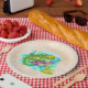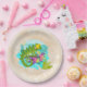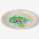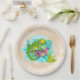 Papier Teller mit einer niedlichen Abbildung einer grünen tropischen Eidechse, umgeben von Blätter und Blume in türkisblauer Farbe.