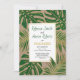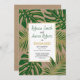 Grün und gold tropische Monstera und Palmen Blätter Kraftpapier Engagement Partei Einladung. Es zeigt ein Muster tropischer Blätter mit goldener Kontur auf Kraftpapier und Ihr Text in einem weißen Rahmen. Auf der Rückseite befindet sich ein goldenes Punktmuster.