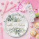Dieses Design zeigt eine Abbildung von grün und goldgrün Blattwerk und goldenen Effekt Konfetti. Braut- und Gräuelnamen werden im Herzen des Schriftartes geschrieben. Wenn Sie diesen kalligrafischen Schriftart verwenden möchten, kontaktieren Sie mich bitte, um die Namen zu ändern. Ansonsten können Sie den Text nach Ihren Wünschen anpassen.