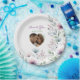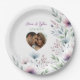 Schöne personalisierte Hochzeitsdinner Papier Teller. Eine elegante Aquarellblüte mit violetten Blumen mit schlängelgrünem und staubblauem Blattwerk und Blumendesign. Fügen Sie Ihren Namen Foto zu diesen Servietten im personalize Bereich. Diese sind für ein Hochzeitsessen oder für ein Brautparty oder einen Junggeselinnen-Abschied sehr schön.