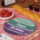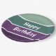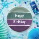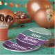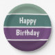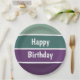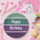 Ein grünes und lila, horizontal gestreiftes Muster und der Text: Happy Birthday. Sie können auf Personalisieren klicken und den Text bearbeiten. Schreiben Sie zwei Wörter in einer Zeile.