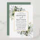 Moderne Elegante Grüne Hochzeit Einladung umfasst botanische Vegetation, Eukalyptus-Blätter und staubblaue Blätter. Legen Sie die Farbe grün zurück. Goldfolie.