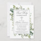 Moderne Elegante Wasserfarbe Botanische Vegetation Erste Heilige Kommunion Einladung beinhaltet Eukalyptus-Blätter und andere schöne Blätter. Silberkreuz. Silver Gray Script.