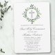 Eleganter botanischer Garten und Eukalyptus Verlasst die erste Einladung der Heiligen Kommunion. Silberkreuz.