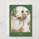 Übermitteln Sie warme Weihnachtsgrüße mit dieser eleganten Wasserfarben-Weihnachtskarte, die einen sanft grün gemalten Baum zeigt, der mit zartem Schnee und goldener Schrift akzentuiert ist und "Frohe Weihnachten - Wir wünschen Ihnen eine Saison voller Wunder und Freude" lautet. Das passende Rückseitendesign enthält einen klassischen, gebogenen Bilderrahmen, der perfekt ist, um Ihr Familienfoto zu präsentieren, umgeben von einem reichen grünen Hintergrund mit subtilen goldenen Akzenten.
