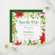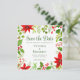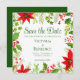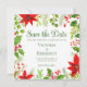 Diese klassische grüne Weihnachtshochzeit Save the Date-Karte bietet helle poinsettia Blume am unteren rechten Rand Ihrer Einladung und rote heilige Beeren und Grün auf der oberen links. Eine festliche und helle botanische Einladung für eine Feiertagshochzeit mit grüner Schrift.