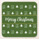 Der Untersetzer ist grün. Es hat ein Muster aus Weihnachtsbäumen und ein Display-Bild. Sie können das Display durch Ihr Firmenlogo ersetzen. Ein elegantes weißes Drehbuch sagt frohe Weihnachten.