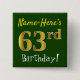 Dieses mögen einfache quadratische KnopfAusrüstungsbeschreibungen eine Mitteilung "Name-Hier 63. Geburtstag! ", mit "63." Imitat/nachgemachten Gold ähnlichen Farbtonblick, auf einem Grün farbigen Hintergrund habend. Der Name kann personalisiert sein. Knöpfe wie diese konnten von den Gästen an einem Geburtstags-Party für jemand möglicherweise getragen werden, das ihren sechzig dritten Geburtstag feiert, in dem das Party in einem großen Bereich mit Losen anderen Leutegeschenkes gehalten wird (wie einem Stadtpark oder einem Themapark). [~Z0000163]