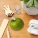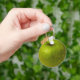 Nahaufnahme eines Single mit grünem Apfel. Der Apfel ist nass und stark mit Tropfen sauberen Wassers bedeckt. Witziger Schlüsselanhänger.