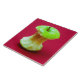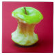 Foto eines großen grünen Apfels vor rotem Hintergrund. Der Apfel wird verzehrt, nur der Kern ist links.