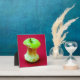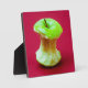Foto eines großen grünen Apfels vor rotem Hintergrund. Der Apfel wird verzehrt, nur der Kern ist links.