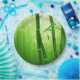 Ein üppiges smaragdgrünes Bild von Bambusstalks mit langen, zarten Blätter und hellblauen Barken im Hintergrund.