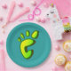 Eine coole Abbildung eines großen Fußabdrucks in einem lebendigen Farbverlauf, in grün und dunkelgrau, auf einem fröhlich türkisfarbenen Hintergrund.