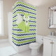 Duschvorhang mit marineblau, grün und weiß Zickzack Streifen und einem niedlich grünen Zickzack Fuchs!