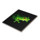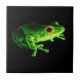 Ein gebrochener grüner Frosch mit feurigen orangen Augen vor schwarzem Hintergrund.