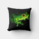 Ein gebrochener grüner Frosch mit feurigen orangen Augen vor schwarzem Hintergrund.