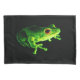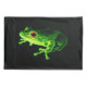 Ein gebrochener grüner Frosch mit feurigen orangen Augen vor schwarzem Hintergrund.