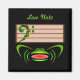 Notenblätter mit einem Bullenfrosch als ganzer niedriger Note und einem Kaulquappen als Basskleber. Die Farben sind in Grüntöne und Gelb für die Frösche und eine verschwommene braun für die Blechlinien.