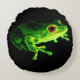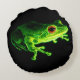 Ein gebrochener grüner Frosch mit feurigen orangen Augen vor schwarzem Hintergrund.