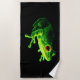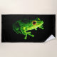 Ein lustiges Strandtuch mit einem gebrochenen grünen Frosch mit kontrastierenden orangen Augen auf schwarzem Hintergrund.