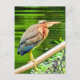 Ein Vogel mit einem langen Schnabel steht auf einem Metallgeländer, neben einem Kettenzaun und Grünpflanzen mit einem ruhigen Gewässer im Hintergrund. Die Szene ist lebendig mit üppiger Vegetation und Reflexionen im Wasser.