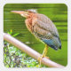 Ein Vogel mit einem langen Schnabel steht auf einem Metallgeländer, neben einem Kettenzaun und Grünpflanzen mit einem ruhigen Gewässer im Hintergrund. Die Szene ist lebendig mit üppiger Vegetation und Reflexionen im Wasser.