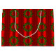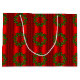 Eine festliche Geschenktasche mit einem Muster grüner Weihnachtskränze auf metallisch rotem Hintergrund, um Ihren Geschenken in dieser Ferienzeit ein wenig Farbe und Stil hinzuzufügen.