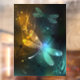 Flug von leuchtender, grüner, künstlerisch gezeichnet Libelle mit durchsichtigen grünen und gelben Flügeln auf glühendem nächtlichen Hintergrund mit marschfarbenen Pflanze und Glühwürmchen. Glühende Libelle.