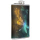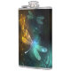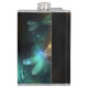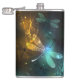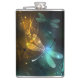 Flug von leuchtender, grüner, künstlerisch gezeichnet Libelle mit durchsichtigen grünen und gelben Flügeln auf glühendem nächtlichen Hintergrund mit marschfarbenen Pflanze und Glühwürmchen. Glühende Libelle.