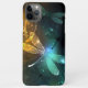 Flug von leuchtender, grüner, künstlerisch gezeichnet Libelle mit durchsichtigen grünen und gelben Flügeln auf glühendem nächtlichen Hintergrund mit marschfarbenen Pflanze und Glühwürmchen. Glühende Libelle.