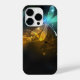 Flug von leuchtender, grüner, künstlerisch gezeichnet Libelle mit durchsichtigen grünen und gelben Flügeln auf glühendem nächtlichen Hintergrund mit marschfarbenen Pflanze und Glühwürmchen. Glühende Libelle.