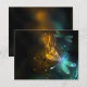 Flug von leuchtender, grüner, künstlerisch gezeichnet Libelle mit durchsichtigen grünen und gelben Flügeln auf glühendem nächtlichen Hintergrund mit marschfarbenen Pflanze und Glühwürmchen. Glühende Libelle.