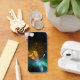 Flug von leuchtender, grüner, künstlerisch gezeichnet Libelle mit durchsichtigen grünen und gelben Flügeln auf glühendem nächtlichen Hintergrund mit marschfarbenen Pflanze und Glühwürmchen. Glühende Libelle.