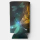 Flug von leuchtender, grüner, künstlerisch gezeichnet Libelle mit durchsichtigen grünen und gelben Flügeln auf glühendem nächtlichen Hintergrund mit marschfarbenen Pflanze und Glühwürmchen. Glühende Libelle.