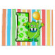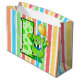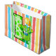 Ein niedliches grünes Monster, gestreifte Hintergrundgeburtstags-Partytasche für Ihr ein Jähriges! Zusammenpassende Partyversorgungen sind verfügbar.