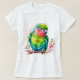 T - Shirt mit einer niedlichen Papagezeige. Ein kleiner grüner Papagei mit blauen und gelben Farbtönen, der sich harmonisch zusammenfügt. Neck hat einen lebendigen Schatten von rötlichem Rosa.