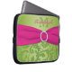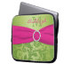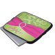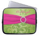 Diese personalisierte grüne Blumendamastlaptophülse mit einer heißes Rosa IMITAT-Band- und -kristallbrosche hat die Textkästen, damit Sie mit Ihrem eigenen Namen, Initialen, Handelsnamen oder anderem Text besonders anfertigen. Wenn Sie irgendeine besonders anfertigende Hilfe benötigen, emailen Sie bitte niteowlstudio@gmail.com.