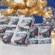 Der Lieblings-grüne Traktor eines Bauern wird vor einer roten Scheune im Schnee geparkt.