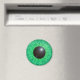 Grünes blaues Auge mit flachem Augapfel mit schwarzer Irisblende und coolem Lichtimpuls