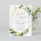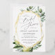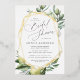 Schöne Natur Thema Braudusche Einladungen sind grau Schrift gerahmt durch eine goldene Folie geometrische Rahmen und zarte Aquarellbilder von mediterranen Pflanzen, Blätter, Oliven und Zitronen. Eine moderne Wahl in einem natürlichen Farbschema für boho oder naturgetreu gestaltete Brautpartys.