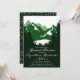Grüne Berge und Nadelbäume Hochzeit Braudusche Einladung. Ein elegantes Hochzeitsdesign, das eine Bergkette durch Koniferen und Ihren Namen in handgeschriebenem Stil zeigt. Auf der Rückseite befindet sich ein weißes Polka-Punktmuster auf dunkelgrün.