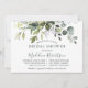 Die moderne Elegant Watercolor Botanical Greenery Bridal Shower Invitation Card beinhaltet Eukalyptus-Blätter, grünes botanisches Blattwerk, staubblaue Blätter und andere schöne botanische Pflanzen. Trendy Kalligrafie Script. Legen Sie die Farbe grün zurück.