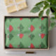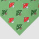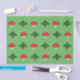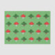Ein Muster festlicher Pilze aus Cartoon. Eine hat eine Kappe wie ein Weihnachtsbaum und die andere hat eine Kappe wie eine Weihnachtsmannmütze. Der Hintergrund ist blassgrün.