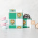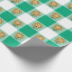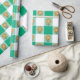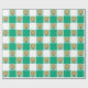 Entzückendes, märchenhaftes grün-weißes Gingham-Muster-Verpackungspapier mit niedlichen gelben Sonnenblumen mit glücklichen Gesichtern in jedem der hellgrünen Quadrate.