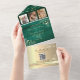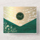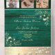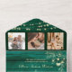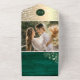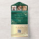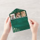 Feiern Sie Ihre Liebe mit unserer eleganten, landesweit inspirierten Hochzeitseinladung. Dieses Design mit einer atemberaubenden Kombination aus Gold und rustikalem Holz mit smaragdgrünen Akzenten ist mit Saitenlichtern und Vintagem boho blumigen Spitzen geschmückt. Personalisieren Sie es mit vier individuellen Fotos des Paares, und fügen Sie Ihre Website und QR-Code für UAWG und weitere Details.