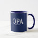 Opa Kaffee Tasse Design mit einem Jahr mit einem weißen Stempel Schriftart Set auf einem Navy Blue Hintergrund. Klicken Sie auf anpassen, um die Hintergrundfarbe zu bearbeiten!. Besuchen Sie unseren Shop, um diese Tasse in einer großen Auswahl von Großvaternamen zu sehen.