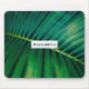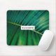 Ein Mousepad mit einem Foto aus einem grünen tropischen Blatt, das einige lebhafte Palmenfronten aufweist. Ein weißes Rechteck, oben platziert mit dem Text.