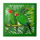 Keramik Kachel in einer Abbildung eines liebevollen Paares von grünen und roten Papageien auf einem Bambusbeil vor einem Hintergrund von Dschungelblättern